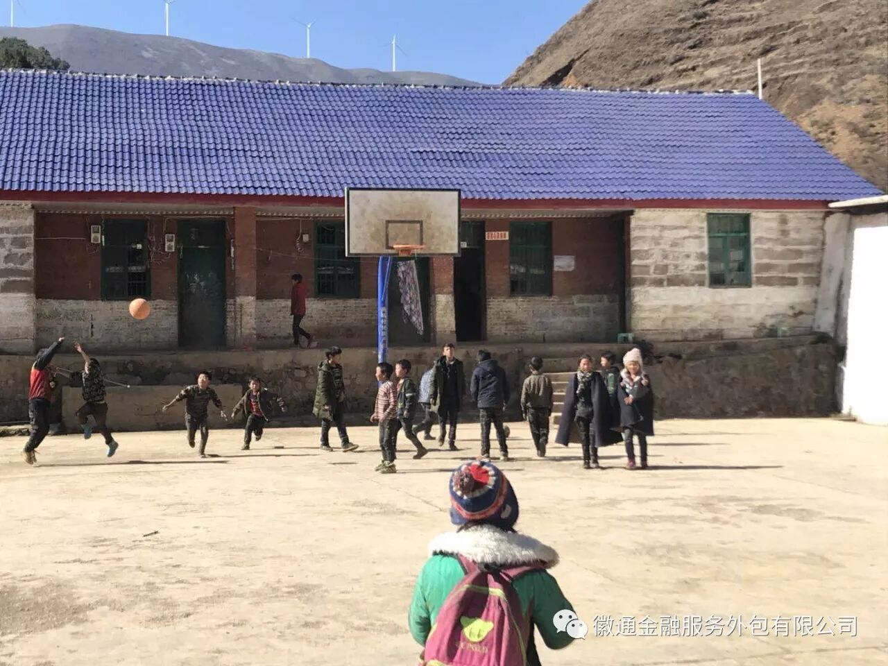 学校很小,建筑在山谷的半坡上,有1个2层的教学楼、1个平房教室,共8个教室,1个教师宿舍、1个学生宿舍、1个操场,到达的时候是下午2点,很多小朋友或在篮球场嘻戏、或在操场里晒太阳。
